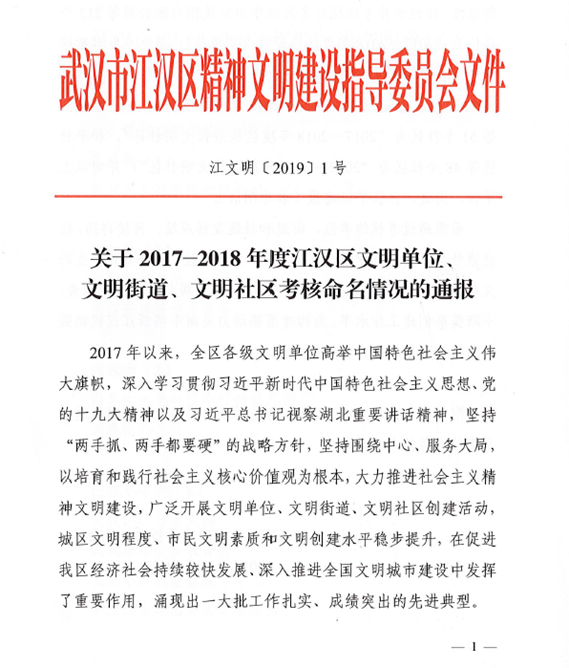 日前,中共武漢市委、武漢市人民政府命名表彰2017—2018年度市級文明單位、文明街道(鄉鎮)、文明社區(村),集團公司獲評“2017—2018年度市級文明單位”。同時,集團公司還被江漢區精神文明建設指導委員會命名為 “2017—2018年度區級最佳文明單位”。