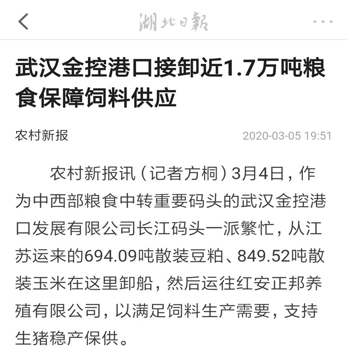 湖北日報:武漢金控港口接卸近1.7萬噸糧食保障飼料供應