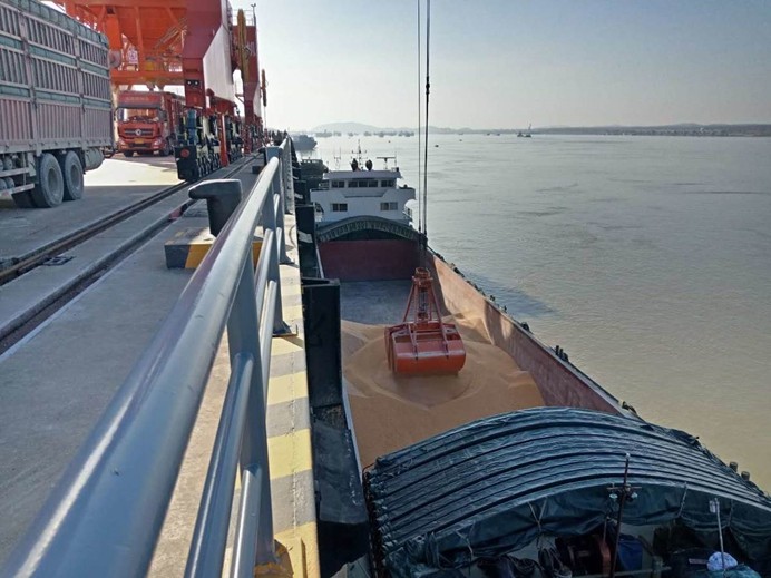 3月4日,作為中西部糧食中轉重要碼頭的武漢金控港口發展有限公司長江碼頭一派繁忙,從江蘇運來的694.09噸散裝豆粕、849.52噸散裝玉米在這里卸船,然后運往紅安正邦養殖有限公司,以滿足飼料生產需要,支持生豬穩產保供。