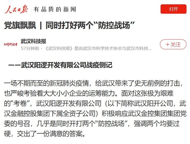 一場不期而至的新冠肺炎疫情,給武漢帶來了史無前例的打擊,也嚴峻考驗著大大小小企業(yè)的運籌能力。面對這張極為艱難的“考卷”,武漢陽邏開發(fā)有限公司(以下簡稱武漢陽開公司,武漢金融控股集團下屬全資子公司)積極響應(yīng)武漢金控集團集團黨委的號召,幾乎是同時開打兩個“防控戰(zhàn)場”,強調(diào)兩個均要過硬,交出了一份滿意的答案。