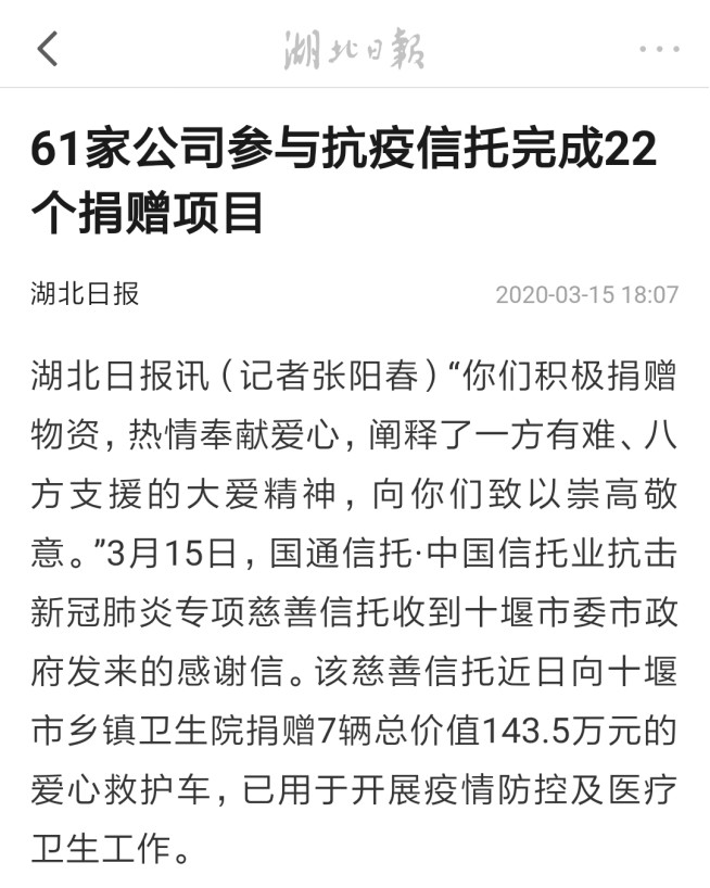 湖北日報:61家公司參與抗疫信托完成22個捐贈項目