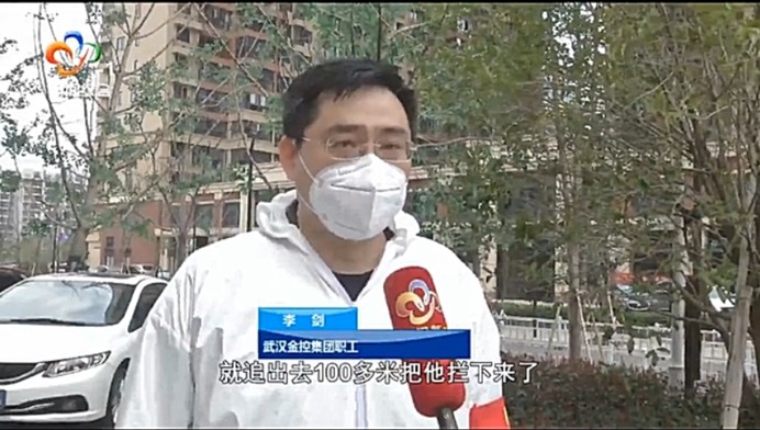 武漢金控集團職工李劍:我和另外一個值守隊員,追出去100多米,把他攔下來,帶回到值守點。當時他把口罩取了,情緒也很激動,沒有任何手續,我們當時也沒跟他正面發生沖突,就是勸阻他,第一要冷靜,第二我們就采取了報警,我們有這樣的要求,堅決不能隨便放過一個。