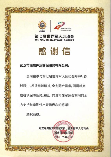 集團旗下融威押運承擔了軍運會主會場“一場兩館”安保,以及賽事槍支押運、獎牌押運、特衛犬服務等任務,軍運會期間累計出勤120天,出勤3.6萬余人次,累計安檢15萬余人次、車輛1萬余臺次,安全運送獎牌2745塊、獎杯50個,多次協助警方、場館方處理安全事件,高質高效完成各項安保任務,確保了場館絕對安全、萬無一失,專業精神受到各方認可,中央電視臺進行了專題跟蹤報告,軍運會執委會專文發送了感謝信。