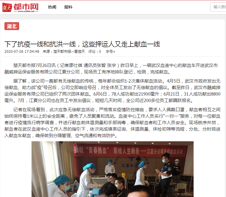 據(jù)了解,該公司一直都有無償獻血的傳統(tǒng),每年都會組織1-2次集體獻血活動。4月5日,武漢市政府發(fā)出無償獻血、助力戰(zhàn)“疫”號召后,公司立即響應號召,對全體員工發(fā)出了無償獻血的倡議。截至昨日,武漢市融威押運保安服務有限公司已組織了兩次團體獻血。6月6日,78人成功獻出21900毫升;6月21日,31人成功獻出8800毫升。7月,江夏分公司也在員工中發(fā)出倡議,短短幾天時間,全公司近200多位員工都踴躍報名。
