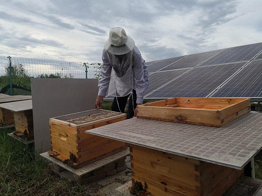 負(fù)責(zé)管護(hù)光伏發(fā)電站的貧困戶龔學(xué)安,正在角落里伺弄20多箱蜜蜂,蜜蜂是工作隊協(xié)調(diào)武漢市農(nóng)科院支持村里給荷花、果樹授粉用的。“今年賣蜜收入幾千元,都?xì)w他個人。”王少奎笑著說,蜜蜂授粉立了大功,蜂蜜又給貧困戶帶來了新收入。