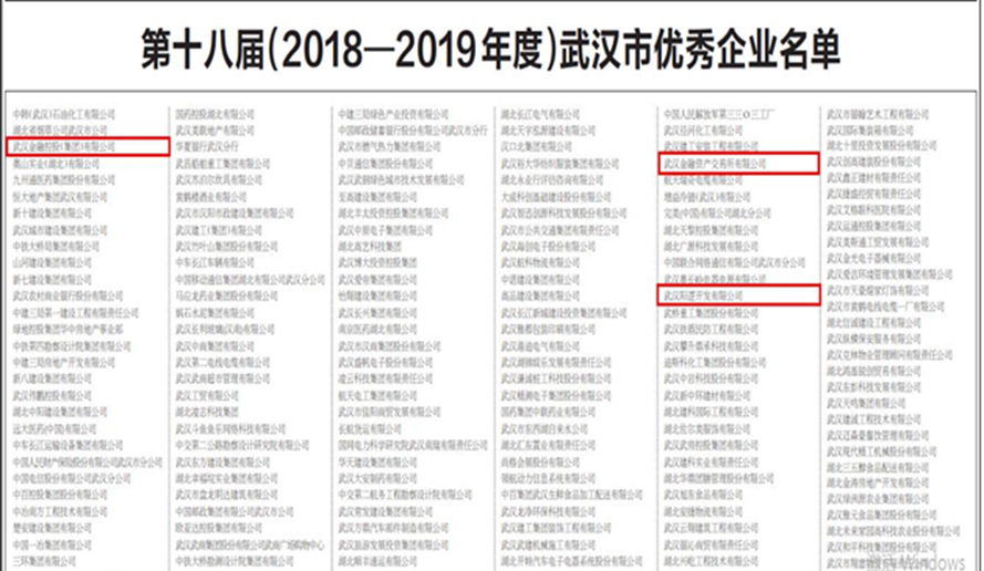 12月15日,武漢企業(yè)聯(lián)合會、武漢企業(yè)家協(xié)會發(fā)布第十八屆(2018-2019年度)武漢優(yōu)秀企業(yè)和優(yōu)秀企業(yè)家榜單,集團公司、武漢金交所、陽開公司榮獲“武漢市優(yōu)秀企業(yè)”稱號,集團總經(jīng)理梅林榮獲“武漢市卓越企業(yè)家”稱號,集團總經(jīng)理助理、融威押運公司董事長王新剛,陽開公司董事長楊浩輝榮獲“武漢市杰出企業(yè)家”稱號。
