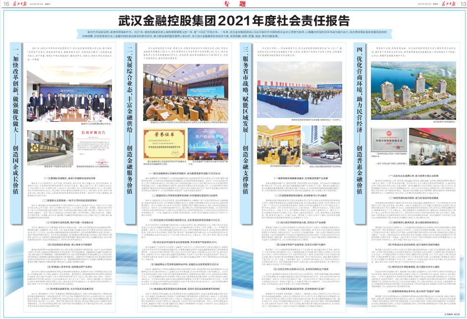 2021年,在武漢市委市政府堅強領導下,武漢金控集團圍繞主責主業,著力推動“優質資產證券化、經營機制市場化、薪酬考核專業化、風險防控計量化”,加快推動盈利能力、資產質量、管理水平等實現新提升,整體競爭力、創新力、影響力和抗風險能力進一步增強。