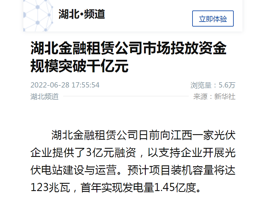 湖北金融租賃公司日前向江西一家光伏企業提供了3億元融資,以支持企業開展光伏電站建設與運營。預計項目裝機容量將達123兆瓦,首年實現發電量1.45億度。