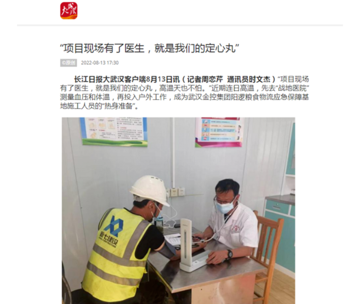 “項目現場有了醫生,我們就像吃了‘定心丸’,高溫天氣里也不怕。”連日來,先去“工地醫院”測量血壓和體溫,再投入戶外工作,成為武漢金控集團陽邏糧食物流應急保障基地施工人員的“熱身準備”。