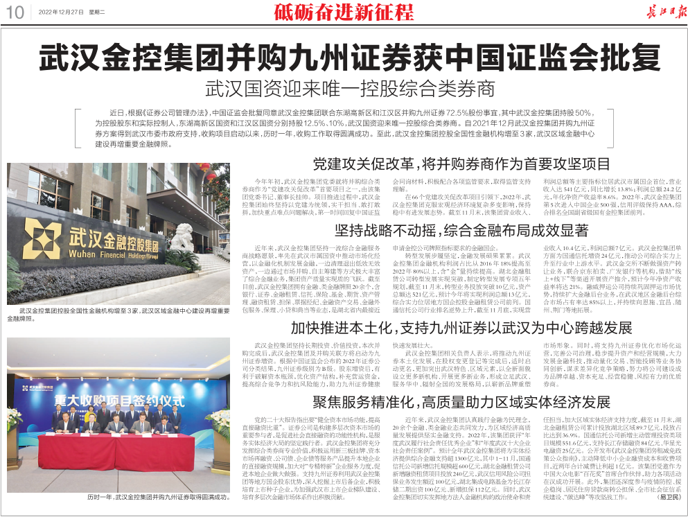 近日,根據(jù)《證券公司管理辦法》,中國證監(jiān)會批復(fù)同意武漢金控集團聯(lián)合東湖高新區(qū)和江漢區(qū)并購九州證券72.5%股份事宜,其中武漢金控集團持股50%,為控股股東和實際控制人,東湖高新區(qū)國資和江漢區(qū)國資分別持股12.5%、10%,武漢國資迎來唯一控股綜合類券商。自2021年12月武漢金控集團并購九州證券方案得到武漢市委市政府支持,收購項目啟動以來,歷時一年,收購工作取得圓滿成功。至此,武漢金控集團控股全國性金融機構(gòu)增至3家,武漢區(qū)域金融中心建設(shè)再增重要金融牌照。