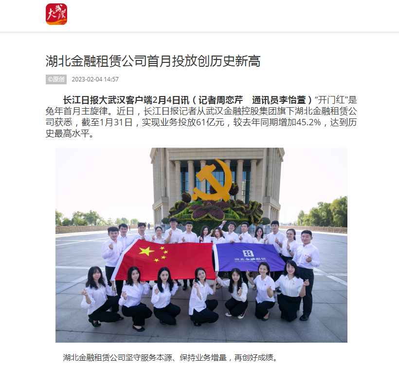 “開門紅”是兔年首月主旋律。近日,長江日報記者從武漢金融控股集團旗下湖北金融租賃公司獲悉,截至1月31日,實現(xiàn)業(yè)務(wù)投放61億元,較去年同期增加45.2%,達到歷史最高水平。