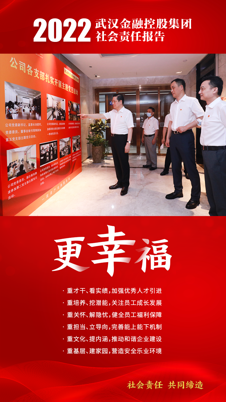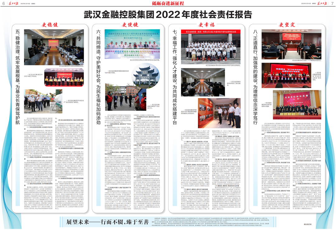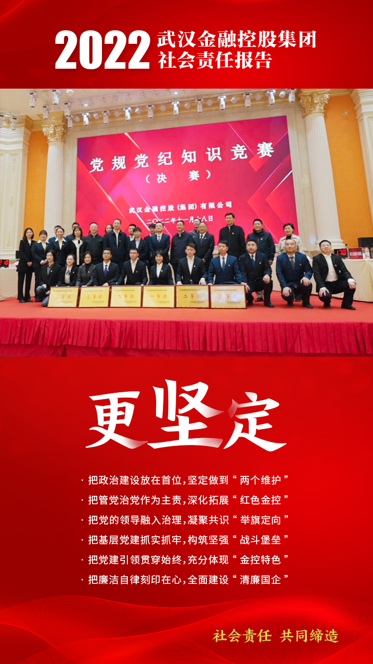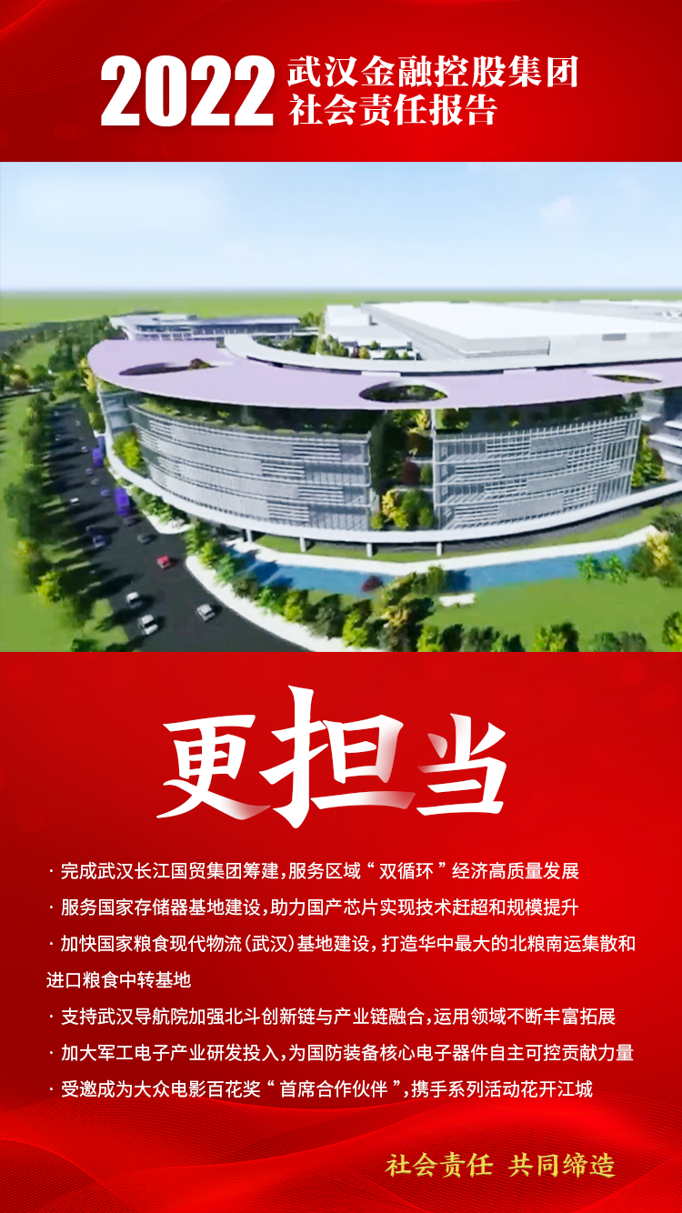 2022年是黨的二十大召開之年,是國企改革三年行動收官之年,武漢金控集團堅持以習近平新時代中國特色社會主義思想為指引,堅決貫徹落實中央和地方重大決策部署,堅守金融服務實體經濟根本屬性,充分發揮綜合金融業態優勢,保持高質量發展同時,在國有資產增值、服務區域經濟、支持重大項目、主動紓困讓利、關愛員工成長、踐行公益慈善等多方面取得良好的履責績效,全年為實體經濟提供綜合金融支持超1300億元,實現政治責任、社會責任、經濟責任的有機統一,集團榮獲“年度武漢履行社會責任優秀企業”。