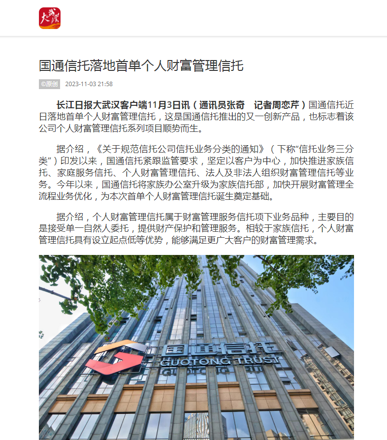 國(guó)通信托近日落地首單個(gè)人財(cái)富管理信托,這是國(guó)通信托推出的又一創(chuàng)新產(chǎn)品,也標(biāo)志著該公司個(gè)人財(cái)富管理信托系列項(xiàng)目順勢(shì)而生。