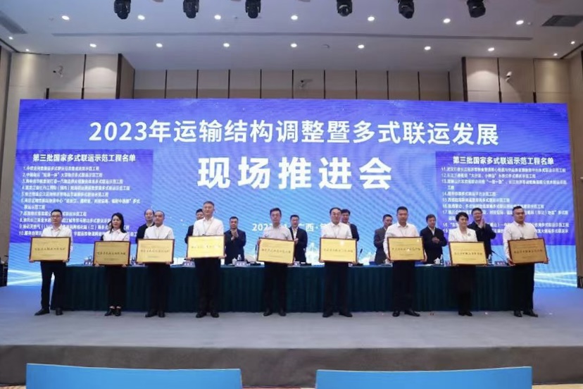 11月14日,2023年運(yùn)輸結(jié)構(gòu)調(diào)整暨多式聯(lián)運(yùn)發(fā)展現(xiàn)場(chǎng)推進(jìn)會(huì)在廣西欽州召開。交通運(yùn)輸部黨組成員、副部長(zhǎng)李揚(yáng)以及參會(huì)有關(guān)部委、局和央企領(lǐng)導(dǎo)出席會(huì)議,交通運(yùn)輸部部屬單位、全國(guó)省和計(jì)劃單列市交通運(yùn)輸部門和多式聯(lián)運(yùn)示范工程授牌企業(yè)參加了會(huì)議。會(huì)上,由集團(tuán)牽頭打造的長(zhǎng)江經(jīng)濟(jì)帶糧食物流核心樞紐與供應(yīng)鏈金融服務(wù)平臺(tái)多式聯(lián)運(yùn)示范項(xiàng)目被授予“國(guó)家多式聯(lián)運(yùn)示范工程” 銘牌。