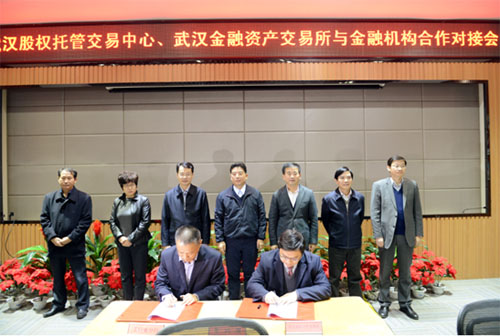 武金所與金融機(jī)構(gòu)合作對接會上,集團(tuán)公司副總經(jīng)理、武金所董事長馮鵬熙與工行湖北省分行副行長張金星簽訂戰(zhàn)略合作協(xié)議。交行湖北省分行副行長李山紅、興業(yè)銀行武漢分行行長周偉分別就與武金所合作情況發(fā)言。