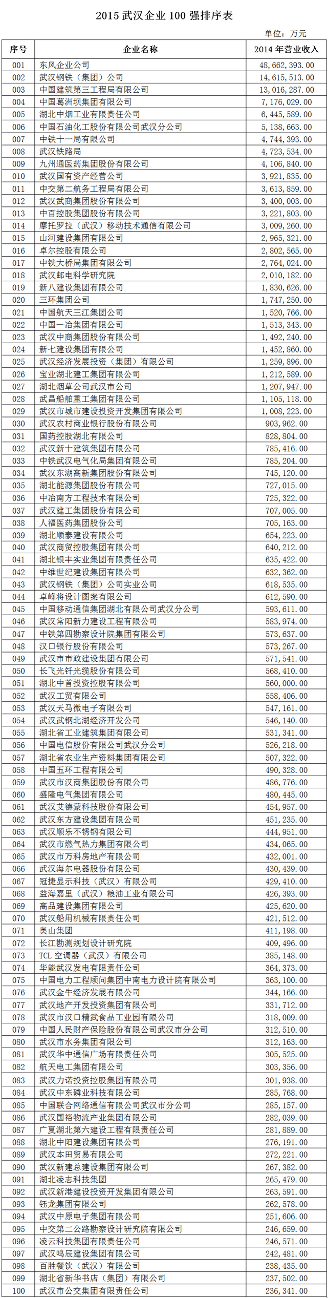10月23日,2015武漢企業(yè)100強(qiáng)、武漢名營(yíng)企業(yè)100強(qiáng)發(fā)布暨第十六屆武漢市優(yōu)秀企業(yè)和優(yōu)秀企業(yè)家表彰大會(huì)在武漢國(guó)際會(huì)展中心隆重舉行。根據(jù)《關(guān)于發(fā)布2015武漢企業(yè)100強(qiáng)的決定》(武企聯(lián)[2015]16號(hào)),集團(tuán)公司再次躋身武漢百?gòu)?qiáng)企業(yè),以126億元的營(yíng)業(yè)收入名列第25位,比去年提升了6位。這是集團(tuán)公司2010年以來(lái)連續(xù)第6次入圍武漢企業(yè)100強(qiáng)。