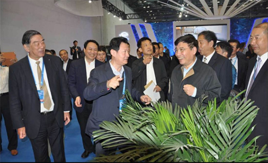 圖一:10月14日下午4點,北京奧運村國家會展中心大廳里燈火輝煌。工信部部長苗圩一行興致勃勃地來到東湖新能源汽車展臺,聽取武漢金融控股集團董事長馬小援關于東湖產業基金投資情況和東湖新能源汽車集團創業情況匯報。
