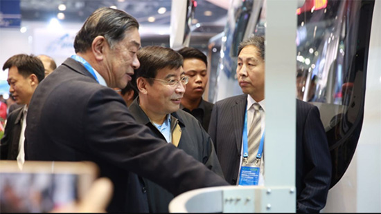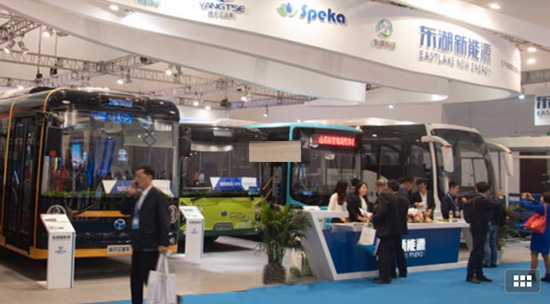 圖四:東湖新能源汽車展位。左一為揚子江客車廠為2017年在摩洛哥召開的世界氣象大會生產的新能源汽車樣車。